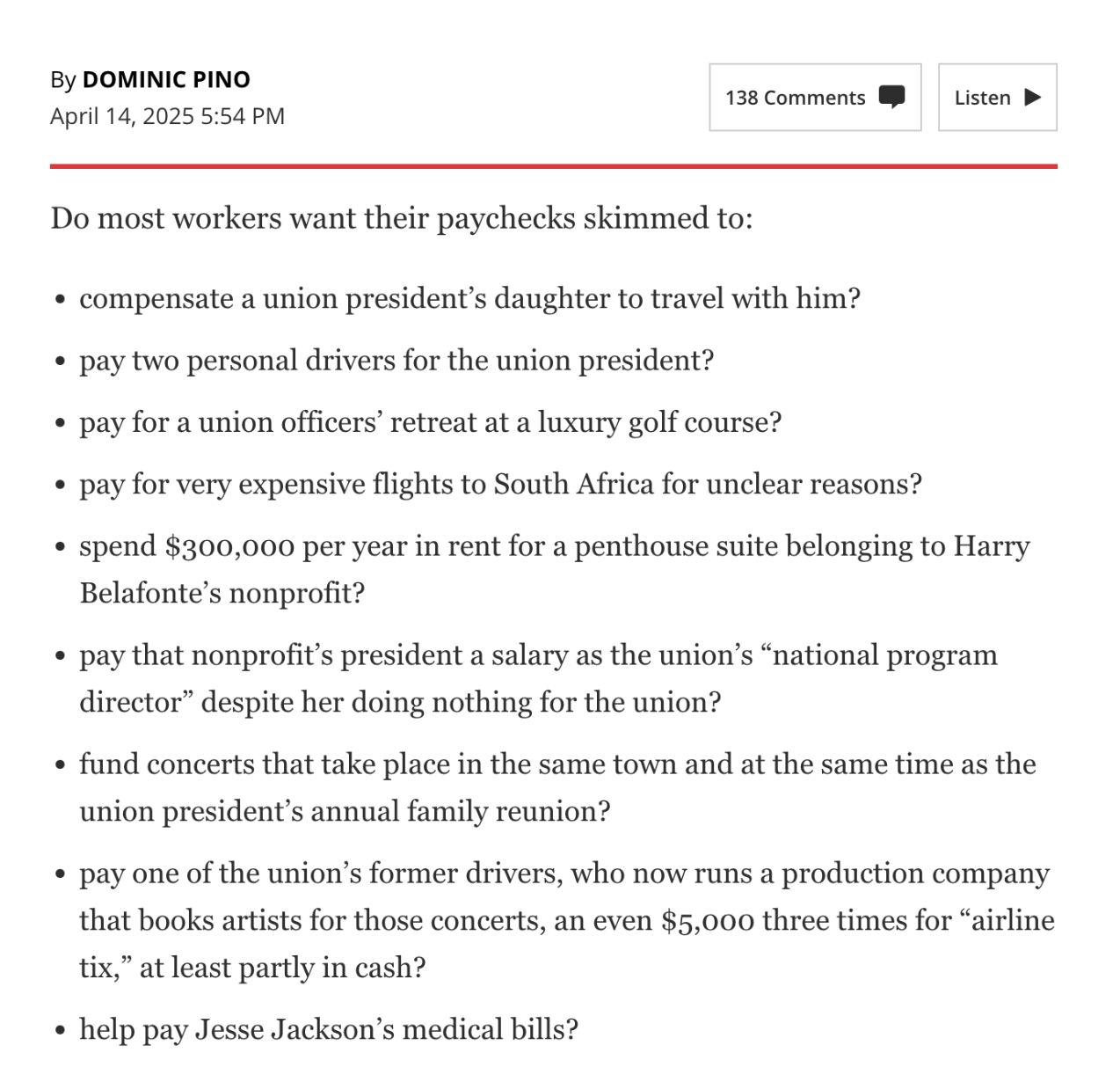 These are all expenses alleged to have been paid by 1199SEIU, the largest health-care workers’ union in the country, in a story by Maya Kaufman of Politico. The union’s president, George Gresham, has been in office since 2007, when he was elected unopposed. There hasn’t been a competitive election for union president since 1989.